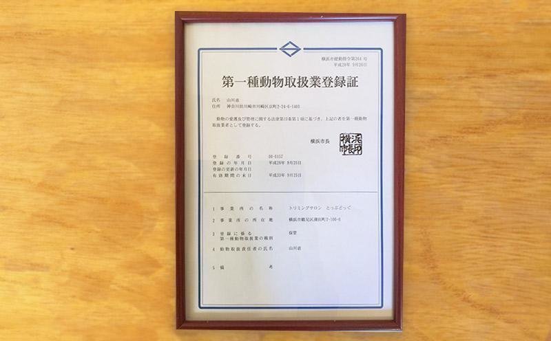 とっぷどっぐは動物の販売や保管・展示などの営業を行う上で必要となる第一種動物取扱業登録証を保有しております。どうぞ安心してご相談ください。